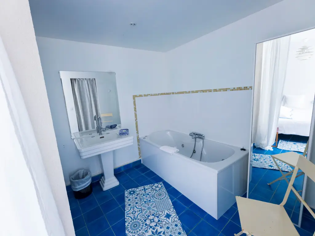 D'une surface de 40m², "La Chambre Bleue" est composé d'une chambre, d'un balcon et d'un accès proche de la piscine.